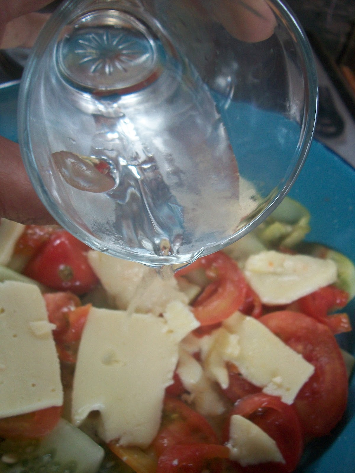 Sobre los pepinos se colocan primero el tomate y luego el queso. Se deja unos minutos cocer y se agrega un poco de agua. Se tapa.