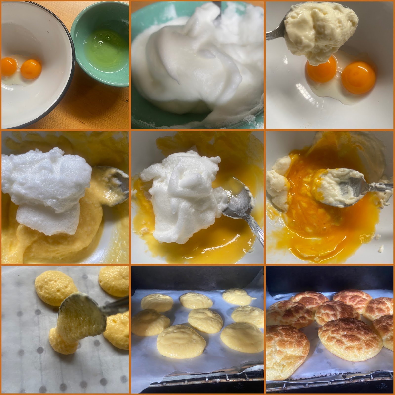 Separar las claras y las yemas de los huevos. Batir las claras a punto de nieve, las yemas se mezclan con una cuchara de queso crema y una vez mezcladas se pasan poco a poco las claras a punto de nieve. Se engrasa un molde con un cuchara de sopa poner la mezcla sobre un papel encerado y se asan a una temperatura de 200 grados por 10 minutos.